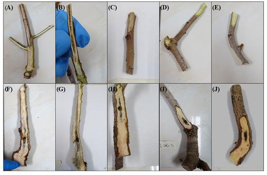Experimentally inoculated pistachio plants after thirty-one weeks. Necrosis in longitudinal section of a twig inoculated (A) with isolate OF148 (T1) and (B) with isolate OF151 (T3). Necrosis in longitudinal section of a trunk sample (F) with isolate OF148 (T2) and (G) with isolate OF151 (T4). (C,H) Control twig inoculated with culture medium. (D,I) Control twig inoculated with E. coli. (E,J) twig wound control.