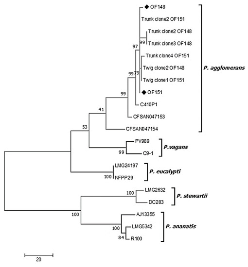 Phylogenetic distribution by the method of maximum parsimony, obtained from the multilocus sequence analysis of the atpD, infB, rpoB, and 16S rRNA genes (2760 bp) of P. agglomerans isolated from pistachio. The values indicated on the nodes represent a bootstrap of 500 repetitions. OF148 and OF151: original isolates, (♦) bacterial isolates from infected plants in the orchard. Sequences from the genus Pantoea are listed below, along with their geographic origins and GenBank accession numbers in square brackets: P. agglomerans CFSAN047153 [USA-NZ_CP034469], P. agglomerans C410P1 [China-NZ_CP016889], P. agglomerans CFSAN047154 [USA-NZ_CP034474], P. eucalypti LMG24197 [Uruguay-NZ_CP045720], P. eucalypti [USA-NZ_FUWI00000000.1], P. vagans PV989 [China-NZ_CP028349], P. vagans C9-1 [Switzerland-NC_014562], P. stewartii LMG2632 [India-NZ_JPKO00000000], P. stewartii DC283 [USA-AHIE00000000], P. ananatis AJ13355 [Japan-AP012032], P. ananatis LMG5342 [Germany-NC_016816], P. ananatis R100 [China-NZ_CP014207].