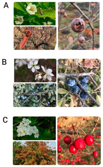 Developing stages and fruits of medlar (A), blackthorn (B) and common hawthorn (C) (photo by N. Mićanović).