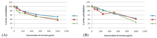 Representative graph of HeLa (A) and FemX (B) cells survival after 72 h cell growth in the presence of increasing concentrations of studied extracts P. spinosa (1), M. germanica (2), and C. monogyna (3).