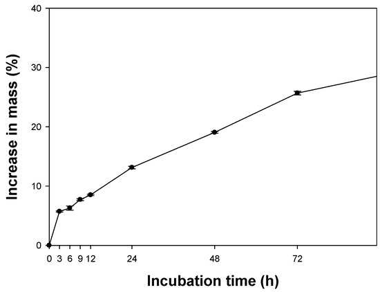 Changes in the mass of the Maianthemum dilatatum seeds during water imbibition test. Error bars indicate mean ± S.E. (n = 4).