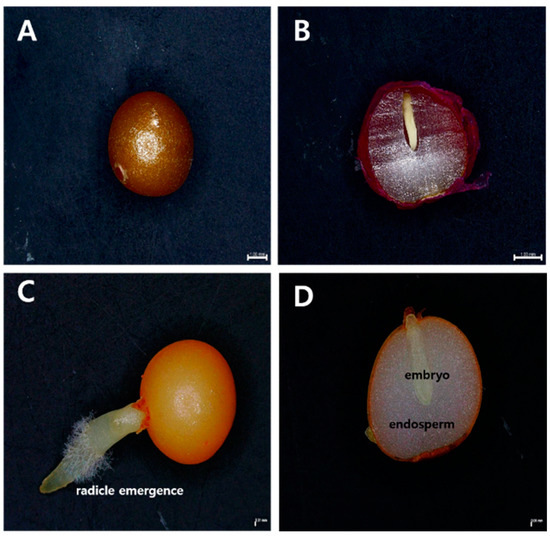 Water imbibition tests were performed to determine whether the seed coat was impermeable. Two pieces of filter paper were laid on a 90 × 15 mm petri dish, distilled water was sufficiently injected, and then seeds were placed in four replicates of 25 seeds. The water absorption rate was calculated by measuring the weight of embedded seeds after 0, 3, 6, 9, 12, 48, and 72 h. The water absorption rate was calculated as Ws% = [(Wh − Wi)/Wi] × 100 [28], where Ws = percentage increase in seed weight, Wh = weight of water imbibed seed, and Wi = initial seed weight. To check whether the embryo was further elongated, embryo length and seed length were measured just before germination. From the measured length of the seed and embryo, the embryo-to-seed (E:S) ratio was calculated.