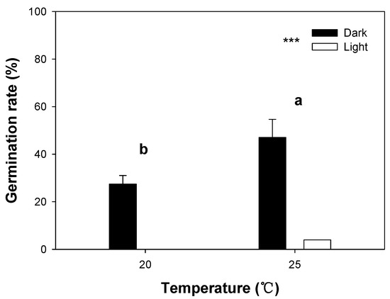 Effect of light and temperature on germination of Maianthemum dilatatum. Error bars indicate mean ± S.E. from four replicates (n = 25). Different letters in the same column indicate significant differences based on Tukey’s multiple range test (p < 0.05). *** is significant at p ≤ 0.001.