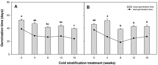 Effect of cold stratification treatment on mean germination time and start germination time in Maianthemum dilatatum. Seeds were incubated at (A) 20 °C and (B) 25 °C for three months. Error bars indicate mean ± S.E. from four replicates (n = 25). Different letters in the same column indicate significant differences based on Tukey’s multiple range test (p < 0.05).