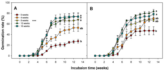 Effect of cold stratification treatments (0, 4, 8, 12, or 16 weeks at 5 °C) on Maianthemum dilatatum seed germination. Seeds were incubated at (A) 20 °C and (B) 25 °C for three months. Error bars indicate mean ± S.E. from four replicates (n = 25). Different letters in the same column indicate significant differences based on Tukey’s multiple range test (p < 0.05). *** is significant at p ≤ 0.001.