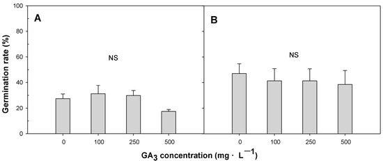Effect of GA3 treatments (0, 100, 250, or 500 mg·L−1) on Maianthemum dilatatum seed germination. Seeds were incubated at (A) 20 °C and (B) 25 °C for three months. Error bars indicate mean ± S.E. from four replicates (n = 25). NS is not significant.