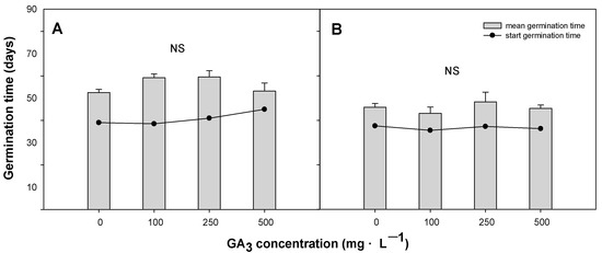 Effect of GA3 treatments on mean germination time and start germination time in Maianthemum dilatatum. Seeds were incubated at 20 °C; (A) and 25 °C; (B) for three months. Error bars indicate mean ± S.E. from four replicates (n = 25). NS is not significant.