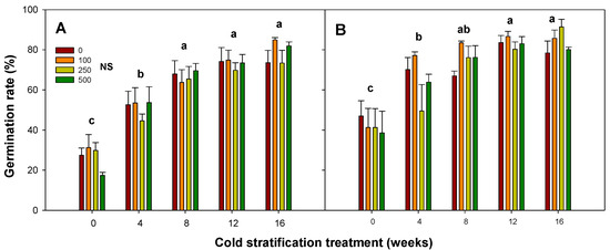 Effect of cold stratification treatments and GA3 treatments on Maianthemum dilatatum seed germination. Seeds were incubated at (A) 20 °C and (B) 25 °C for three months. Error bars indicate mean ± S.E. from four replicates (n = 25). NS is not significant. Different letters in the same column indicate significant differences based on Tukey’s multiple range test (p < 0.05).