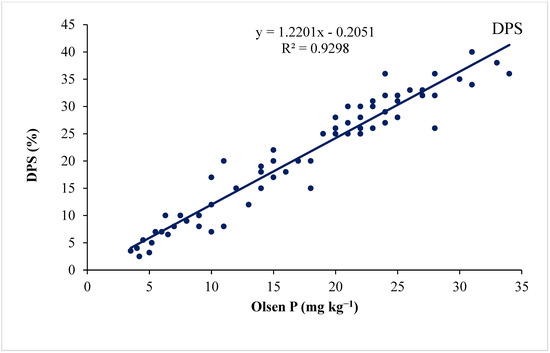 P loss risk was investigated by DPS determination and the data are shown in Table 2. Increasing the doses of P fertilizer significantly (p < 0.05) increased DPS in the sandy calcareous soil. DPS values varied between 3.83 and 32.47%. The maximum DPS values were found in the soil fertilized with 240 g P tree−1, while the lowest ones were recorded in the control. DPS in the soil fertilized with P doses < 90 g P tree−1 was decreased with time, while it was increased when the soil was fertilized with P doses ≥ 90 g Ptree−1. DPS in the soil fertilized with 240 g P tree−1 increased from an initial value of 3.83 to 32.47% after four years of P-fertilization. P doses ≥ 90 g P tre−1 caused remarkable increases in the DPS after four years of fertilization. The relationship between Olsen P and DPS is shown in Figure 1. The liner regression correlation between Olsen p values and DPS was positive and significant (R2 = 0.94); therefore, the regression equations were used to calculate the critical p value, which gives us DPS values above 25%. According to the obtained results, the sandy soil containing values of available P higher than 20.3 mg kg−1 increases P-loss risk.