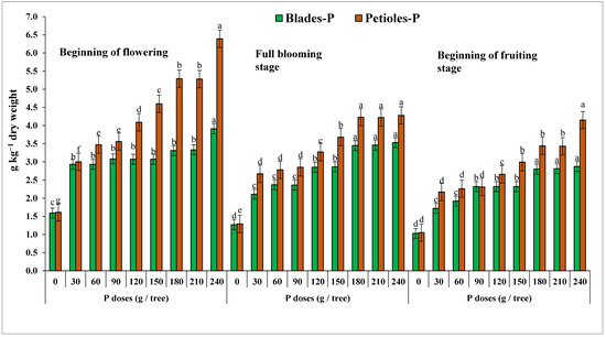 P fertilizer significantly (p < 0.01) raised P concentrations in mango leaves at all growth stages (Figure 2). P concentrations in the blades ranged between 1.03 and 3.91 g kg−1, while in the petioles it ranged between 1.05 and 6.39 g kg−1. P concentrations in the petioles were higher than concentrations in the blades in all the studied growth stages. The concentrations of P in the blades and petioles in all the growth stages can be arranged in descending order: beginning of flowering stage > full blooming stage > beginning fruiting stage.