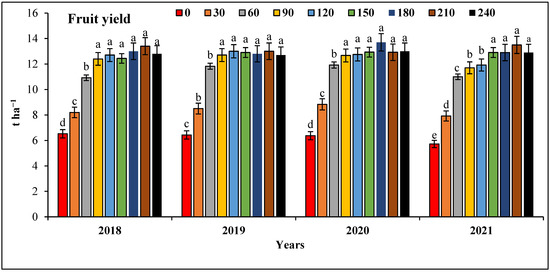 where RY is the relative yield, Yf is the fruit yield of a treatment (t ha−1); and Ym is the maximum yield of each year (t ha−1).