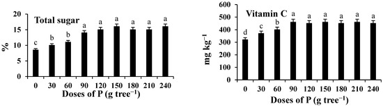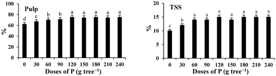 The response of mango fruit yield and quality to P doses was investigated and the results are illustrated in Figure 3 and Figure 4. The fruit yield ranged between 5.72 and 13.7 t ha−1. The fruit yield of mango responded significantly to the application of P doses through the four years. The maximum significant fruit yield was obtained from P doses ≥ 90 g P tree−1; the response of fruit yield to P doses above this level was in-significant. The application of P fertilizer significantly (p < 0.05) increased the fruit quality of mango. The addition of P increased the pulp, total soluble solids, total sugar, and vitamin C in the fruit of mango. In most cases, the addition of high levels of phosphate fertilization (>90 g P tree−1) did not lead to any significant increases in the measured quality characteristics.