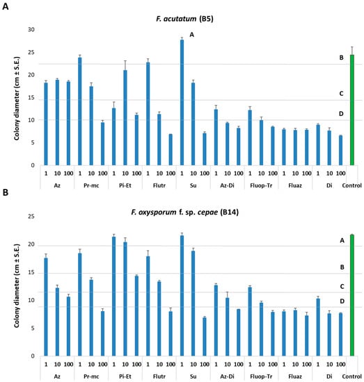 The effect of selected pesticides on the development of F. oxysporum f. sp. cepae (A, strain B14) and F. acutatum (B, strain B5) in culture plates. The pesticides were tested at concentrations of 1, 10, and 100 ppm. Mycelial discs from a 8-day-old colony were sown on potato dextrose agar (PDA) medium plates that contained pesticides in three concentrations and incubated for two days. Controls (green columns) are PDA without fungicides. Bars represent the mean colony diameter of four replicates, and error bars signify a standard error. Different letters (A–D, on the chart’s right side) represent a significant difference (p < 0.05) in the ANOVA test.