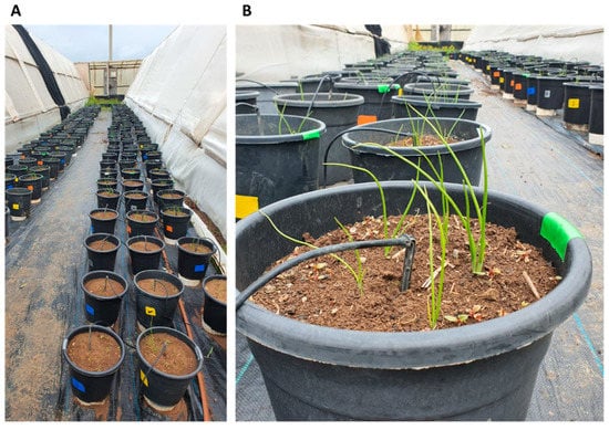 The semi-field pot experiment setting (A) and the 3rd-day aboveground sprouting (B). Two onion varieties were tested in a pot trial under field conditions at the Avnei Eitan Experimental Farm in the Golan Heights (north-eastern Israel): white Orlando cv. (A, left side pots) and red Noam cv. (A, right side pots). The pots were infected separately with each pathogen, F. oxysporum f. sp. cepae (B14) and F. acutatum (B5), and tested against a combination of the two pathogens and an unprotected control. Three pesticides were inspected as protective treatments: Prochloraz (Pr), Azoxystrobin + Tebuconazole (Az-Te), and Fludioxonil + Sedaxen (Fl-Se) (Table 1). The pots in the Prochloraz and Az-Te treatments were divided into two subgroups of five pots—a high-dose (0.3%) and a low-dose (0.15%) pesticide treatment applied 16, 35, and 56 days after sowing. The Fl-Se preparation was applied by seed dressing (0.003 microliters per seed).