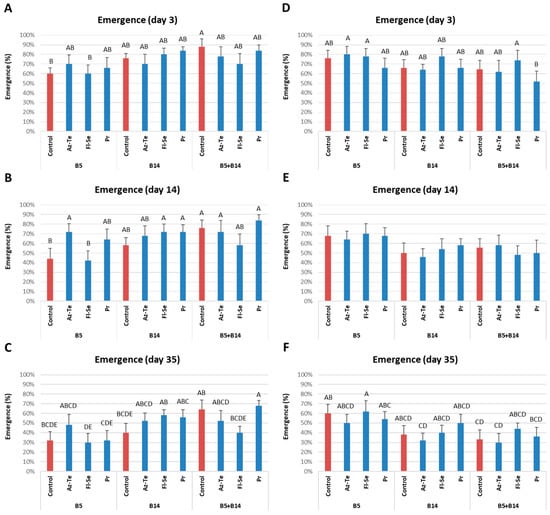 The effect of chemo-pesticide treatments on the emergence and survival of white onion plants (Orlando cv., A–C) and red onion plants (Noam cv., D–F) 4, 14, and 35 days after the beginning of the soil surface appearance. B5-F. acutatum, B14-F. oxysporum f. sp. cepae. The experiment and abbreviations are described in Figure 2. Bars indicate the mean of 10 biological replications (pots). Controls (red columns) are plants without fungicides. Error bars are standard errors. If it exists, different letters (A–E, above the chart’s bars) represent a significant difference (p < 0.05) in the ANOVA test.