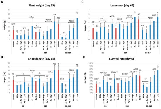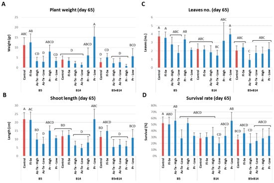 Effect of pesticide treatments on the growth indexes and survival of red onion plants (Noam cv.) 65 days after soil surface germination. The experiment and abbreviations are described in Figure 2. The mid-season evaluation included the plants’ weight (A), shoot length (B) and phenological development (number of leaves, C). Each value is an average of four plants/pot. The survival rate (D) is the percentage of five plants/pot. B5-F. acutatum, B14-F. oxysporum f. sp. cepae. Bars indicate the mean of five (Prochloraz and Az-Te) or 10 (Fl-Se) biological replications (pots). Controls (red columns) are plants without fungicides. Error bars are standard errors. Different letters above the chart’s bars (A–D) represent a significant difference (p < 0.05) in the ANOVA test.