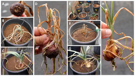 The experimental photos at the end of the season (day 115 from soil surface germination). The experiment is described in Figure 2. (A–D) onion Fusarium basal rot (FBR) disease symptoms in the red Noam cv. plants. (E–G) symptoms in the white Orlando cv. plants. (E) representative photo of the disease diversity among the different treatments. (A,B,D,F,H) severe disease, (C,G) mild disease.