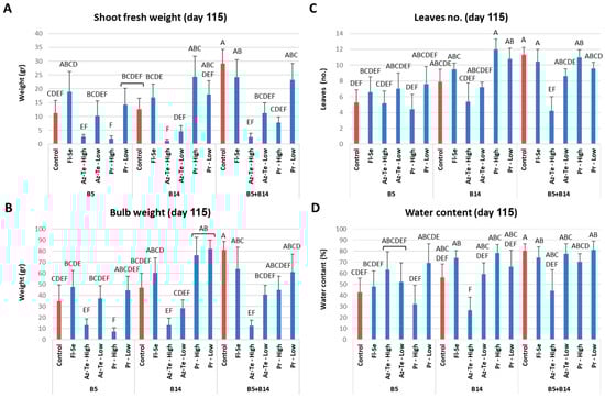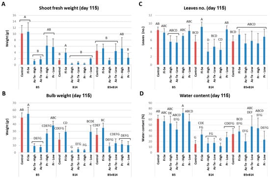 The different growth measures used in the current study showed similar tendencies (for instance, see Figure 7 and Figure 8). This is not surprising because the main FBR symptom at the maturity phase is dehydration of the plant’s upper parts (including the leaves and flowers) [8]. As a result of the water content drop, the plants lose weight, their development is disrupted (they are shorter and have fewer leaves), and their bulb development is delayed. Successful chemical protective treatments such as Prochloraz and Fl-Se are reflected in recovering these indices, as demonstrated here.