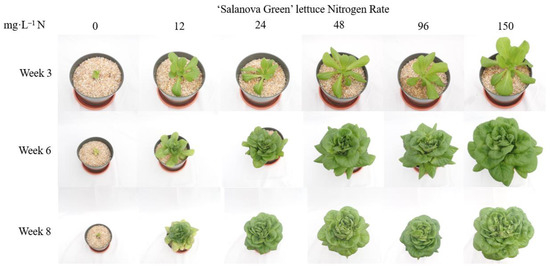 Visual impact of nitrogen (N) fertility rate on Lactuca sativa ‘Salanova Green’ at Weeks 3, 6, and 8.