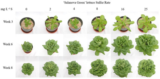 Visual impact of sulfur (S) fertility rate on Lactuca sativa ‘Salanova Green’ at Weeks 3, 6, and 8.