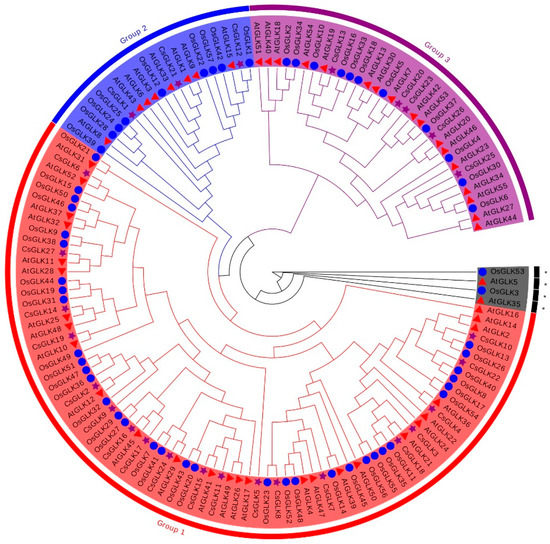 Figure 1. Phylogenetic analysis of Citrus sinensis, Arabidopsis thaliana and Oryza sativa GLKs. Circles of different colors represented different subgroups. ☆ represented citrus, ○ represented maize and △ represented Arabidopsis. * referred to proteins that were not clustered. The tree was constructed from amino sequences using MEGA-X software by the neighbor-joining program with 1000 bootstrap replicates. Clades with different colors represent diverse subgroup.