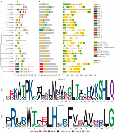 Figure 2. (A) Protein phylogeny, (B) conserved motif, (C) conserved domain, (D) gene structure and (E) conserved domain sequence. The scale bar at the bottom was used to estimate the sizes of protein structure and gene structure.
