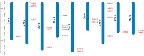 In total, 27 CsGLKs were distributed on each chromosome. The number of CsGLKs on chromosomes 4 and 7 were the largest, and there was only one GLK gene on chromosome 1 (Figure 4). The uneven distribution of CsGLKs was similar to that of maize [37].