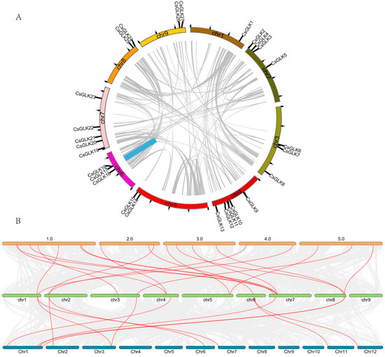 Figure 5. Collinearity analysis of CsGLK. (A) GLK gene replication event. The grey line represented all autosomes in the Citrus genome, and the blue line represented CsGLK gene replication events. (B) The homologous gene pairs between sweet orange and Arabidopsis and sweet orange and rice. The yellow chromosome represented Arabidopsis, the blue chromosome represented rice and the green chromosome represented Citrus. Red lines indicated homologous gene pairs.