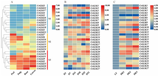 Figure 6. (A) Expression of CsGLKs in different tissues. (B) Expression of CsGLKs in different growth stages. (C) Expression of CsGLKs under dark stress. Color gradient from red to blue indicates that expression values change from high to low.