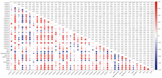 Figure 8. Correlation analysis. Color and size changes represented the degree of correlation. The larger the circular area and the darker the color, the stronger the correlation, and vice versa. Red represented negative correlations and blue represents positive correlations. * in the circular area means significant correlation (p ≤ 0.05).