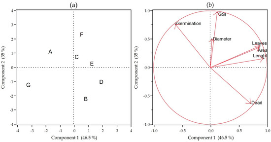 Score graph (a) and load graph (b) of PCA of seven parameters evaluated in C. brasiliense seedlings at 60 days after sowing, from seeds stored for 40 days, submitted to seven treatments (six concentrations of GA3 and dry seeds without pre-soaking). Score chart legend (a): 0 mg L−1 of GA3 (A), 50 (C), 100 (B), 500 (F), 1000 (E), 2000 (D), and dry seeds (G). Load graph legend (b): stem length, stem diameter, number of leaves, leaf area, germination speed index (GSI), percentage of germination, and percentage of dead seeds.