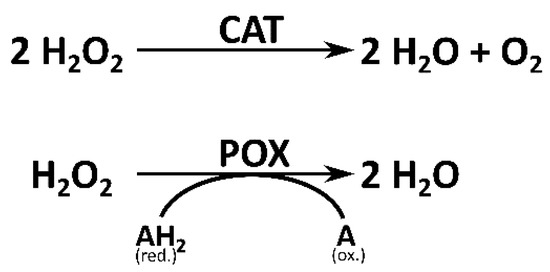 Schematic representation of the reactions of hydrogen peroxide (H2O2)-scavenging enzymes catalase (CAT) and peroxidase (POX). CAT does not require an electron donor for the conversion of H2O2 into water (H2O) and oxygen (O2). POXs use a range of molecules as reductants (AH2), for instance, phenolic compounds. By the reduction of H2O2 into H2O, AH2 is oxidized into A [21,24].