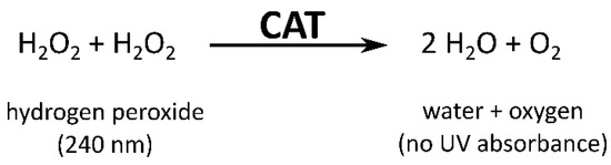 Schematic representation of the photometric determination of catalase activity (CAT). The conversion of H2O2 catalyzed by CAT is followed by the decrease in absorbance at 240 nm [46]. Figure modified after Aebi [46].