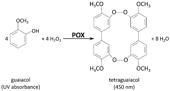 The determination of peroxidase (POX) and cell wall-bound peroxidase (cwPOX) activities in apple leaf buds was carried out according to a protocol slightly modified from Fimognari et al. [43]: Crude extracts (for POX) or cell wall extracts (for cwPOX) were mixed with 0.45 mM H2O2 and 2 mM guaiacol in 100 mM K2HPO4/KH2PO4 buffer at pH 7. For the control reactions, H2O2 was omitted. The increase in absorbance, representing the oxidation of guaiacol to tetraguaiacol (Figure 3) [47], was recorded at 450 nm for 25 min at 30 °C. For the calculation of POX activity, the extinction coefficient 25,500 [L mol−1 cm−1] was used.