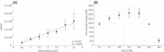 Dose-dependent linearity of catalase (CAT) assay, performed with the original substrate concentration of 100 mM according to Fimognari et al. [43] (A) and variation of the substrate (H2O2) concentrations for catalase (CAT) assay (B). Changes in absorbance per second [ΔAbs/s] (A) and CAT activity [nkat/g aDW] (B) are shown as mean values ± standard deviation (n = 3). The negative values resulting in the decrease of absorbance were multiplied by −1 to receive positive values.