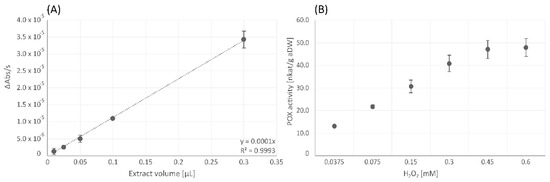 Dose-dependent linearity of peroxidase assay, performed with the original substrate concentration of 0.15 mM according to Fimognari et al. [43] (A) and variation of substrate (H2O2) concentrations for peroxidase (POX) assay (B). Changes in absorbance per second [ΔAbs/s] (A) and peroxidase (POX) activity [nkat/g aDW] (B) are shown as mean values ± standard deviation (n = 3).