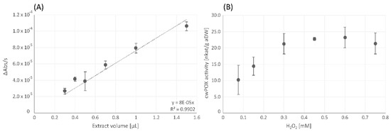 The cwPOX activity assay showed dose-dependent linearity of the increase in absorbance per second detected at 450 nm (Figure 6A). Concerning the substrate saturation for cwPOX, the concentration of H2O2 had to be increased from the initial 0.15 mM to 0.45 mM to make sure that substrate availability was not a limiting factor in the reaction (Figure 6B).