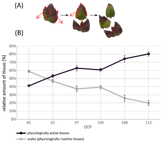 Process of descaling apple leaf buds (A) and relative amount [%] of bud scales and physiologically active tissues of apple leaf buds on each sampling date, expressed as day of the year [DOY] (B). Data points are shown as mean values ± standard deviation (n = 5).