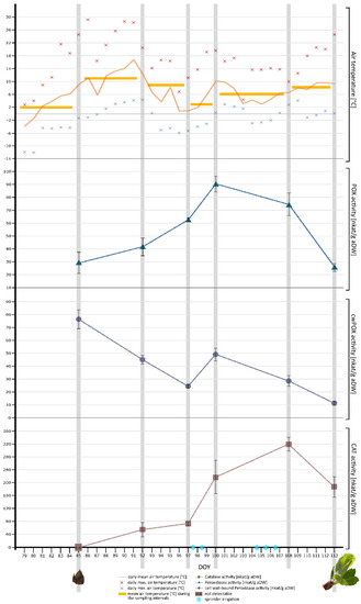 cwPOX activity was relatively high at the beginning of the investigation period at approximately 76 nkat/g aDW. From DOY 85 to DOY 92, cwPOX activity sharply decreased to approximately 45 nkat/g aDW, which corresponds to a decrease of 70% in cwPOX activity. cwPOX activity then further decreased from DOY 92 to DOY 97 to approximately 24 nkat/g aDW, which corresponds to more than an 80% decrease in cwPOX activity. From DOY 97 to DOY 100, cwPOX activity sharply increased, doubling its activity from approximately 24 nkat/g aDW to 49 nkat/g aDW and then decreased again until the end of the observation period (DOY 113). Generally, the curve progression of cwPOX activity as seen in Figure 8 shows a decrease over the entire observation period with a single peak from DOY 97 to DOY 100.