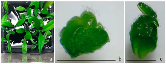 Figure 1. The micro-shoots and shoot tips of Citrus spp. used in experiments. The micro-shoots of C. deliciosa cv. “Bodrum Mandarin” derived from in vitro clonal propagiton (a), the shoot tips in different sizes derived from micro-shoots of C. nobilis cv. “Klin Mandarin” (b,c), bars 1 mm.