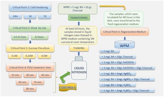 The samples of each cultivar were sucrose-precultured by removing the shoot tips in two different sizes after the cold preculture step. Afterward, the vitrification solution application (at the different treatment times mentioned above) and immersion in liquid nitrogen and thawing steps were applied to the shoot tips. The samples stored in liquid nitrogen for at least 24 h were thawed by direct transfer to a liquid WPM nutrient medium containing 1 M sucrose (pH, 5.8) at room temperature. For this process, aluminum foils containing shoot tips, which are treated with liquid nitrogen and the control group (not treated with liquid nitrogen) were removed from the cryovials and immersed in the sucrose liquid nutrient medium in Petri dishes. The shoot tips were washed in the same nutrient medium for 15 min and the PVS2 solution was diluted from the cells and tissues. Afterwards, the samples were transferred on solid WPM medium supplement with 10 g.L−1 charcoal, 1 mg.L−1 BAP and 7 g.L−1 agar (pH, 5.8) for 24 h (Figure 3c), and after 24 h, the samples were transferred to different nutrient media [WPM medium supplemented with 1 mg.L−1 BAP; 1 mg.L−1 BAP and 10 g.L−1 charcoal; 1 mg.L−1 BAP and 10 g.L−1 FeEDDHA; 1 mg.L−1 BAP, 10 g.L−1 FeEDDHA and 10 g.L−1 charcoal; 1 mg.L−1 BAP and 10 g.L−1 AgNO3; 1 mg.L−1 BAP, 10 g.L−1 AgNO3 and 10 g.L−1 charcoal; 1 mg.L−1 BAP and 10 g.L−1 H3BO3; 1 mg.L−1 BAP, 10 g.L−1 H3BO3 and 10 g.L−1 charcoal, and each media also contains 7 g.L−1 agar (pH, 5.8)] to observe their regeneration during the final recovery (Figure 2).