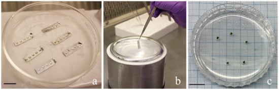 For cryopreservation, a droplet vitrification technique, which is a more effective, easily applicable, and inexpensive method for many species, was applied [29]. After cold-hardening and sucrose preculture treatment, the shoot tips were transferred to aluminum foil strips (~0.5 × 2 cm in size) containing 3 µL PVS2 for each drop [35]. A total of five drops were dropped on the aluminum foil strip, and each shoot tip was placed on each drop (Figure 3a). Each shoot tip was treated with PVS2 for 15, 30, 45, 60, 75, or 90 min on ice (to prevent cell damage due to the rapid infiltration of osmotic agents). After treatment with PVS2, aluminum foils with shoot tips were plunged into liquid nitrogen by transferring them into cryovials in liquid nitrogen (Figure 3b). The control samples were treated with PVS2 for 15, 30, 45, 60, 75, or 90 min but not immersed in liquid nitrogen.
