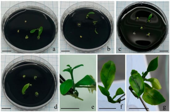 Figure 4. The shoot tip regrowth of Citrus spp. after optimized cryopreservation. After three days of cold-hardening application, shoot tip explants cut in 0.3–0.7 mm size were taken to the sucrose preculture stage on solid WPM nutrient medium containing 0.25 M sucrose. Then, they were kept in droplets containing 3 µL PVS2 for 45 min, and they were incubated on solid WPM nutrient medium containing 1 mg.L−1 BAP and 10 mg.L−1 charcoal for 24 h. Then, they were transferred to WPM solid nutrient medium supplemented with 1 mg.L−1 BAP, 1 mg.L−1 H3BO3, and 10 mg.L−1 charcoal (a) cv. Bodrum Mandarin; (b) cv. Klin Mandarin; (c) white grapefruit and (d) red grapefruit after four weeks incubation; (e) cv. Bodrum Mandarin; (f) cv. Klin Mandarin; (g) red grapefruit after eight weeks incubation, bars 1 cm.