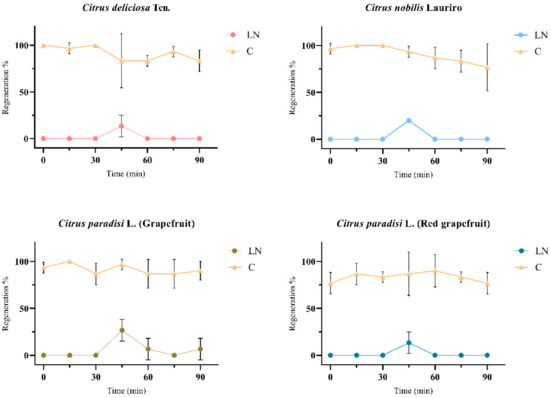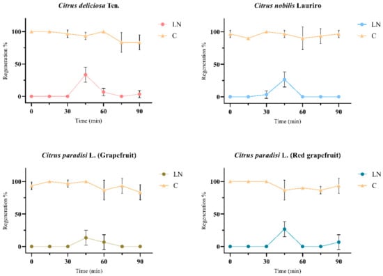 Figure 5. The shoot-tips regenerations of liquid nitrogen (LN) and control (C) groups of four different Citrus spp. cultivars after cryogenic applications on solid WPM medium supplemented with 1 mg.L−1 BAP, 10 mg.L−1 activated charcoal, and 1 mg.L−1 FeEDDHA. The graphs were formed according to the shoot tip regeneration data, which obtained the best regeneration in the optimized cryogenic applications and then treated with PVS2 at different times. In addition, shoot tips untreated with PVS2 (0 min) were also given as the control group of PVS2 treated with different time in graph. The graphs represent the mean ± SD (p < 0.05).