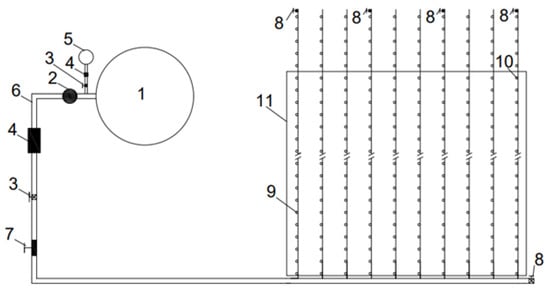 Schematic diagram of the drip irrigation system used to evaluate fertilizer and water spatial distribution uniformity. (1) Water reservoir; (2) pump; (3) valve; (4) filter; (5) fertilizer solution reservoir; (6) 50 mm diameter PVC pipe; (7) pressure-regulating valve; (8) flushing valve; (9) dripper; (10) ideal dripper to determine advance time in drip system; (11) monitored area.