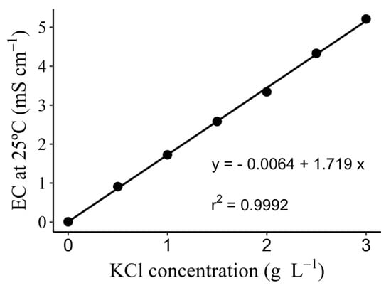 where C is the KCl concentration in the solution (g L−1) and EC25 is the value of electrical conductivity compensated at 25 °C (mS cm−1). The coefficient of determination of Equation (1) was 0.9992, which indicates a well-fitted equation that can be used to calculate the concentration of KCl fertilizer in the water discharged by the dripper.