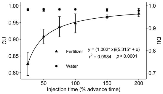 Christiansen’s uniformity coefficient (CU) and distribution uniformity (DU) of fertilizer as a function of injection time (% of advance time). Error bar indicates the standard deviation for CU. * Significant coefficient via t-test (p < 0.01).