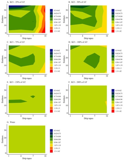 The injection time impacted the spatial distribution uniformity of KCL, according to the contour plots (Figure 4). In the shorter injection times (Figure 4A,B), the spatial distribution of KCl showed a deficit area in the final part of the initial drip lines (1st to 5th) and excess area in the final drip lines (7th to 10th). At the intermediate injection times (Figure 4C,D), the spatial distribution of KCl showed areas with deficit in the central and final parts of the first lateral lines (1st to 3rd), and relatively small areas with excess in the initial and final parts of the last ones (8th to 10th) in the fertigated area. At longer injection times (Figure 4E,F), the spatial distribution of KCl was more homogeneous with relatively small areas with deficit or excess. The spatial distribution of KCl with injection time equivalent to 200% AT showed homogeneity more similar to the spatial distribution of water. The spatial distribution of irrigation water was quite homogeneous (Figure 4G).