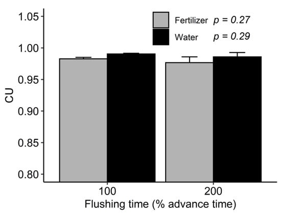 Christiansen’s uniformity coefficient (CU) of KCl fertilizer and water for two flushing times (100 and 200% of advance time). p-values for the CU of fertilizer and water. Error bar indicates the standard deviation.