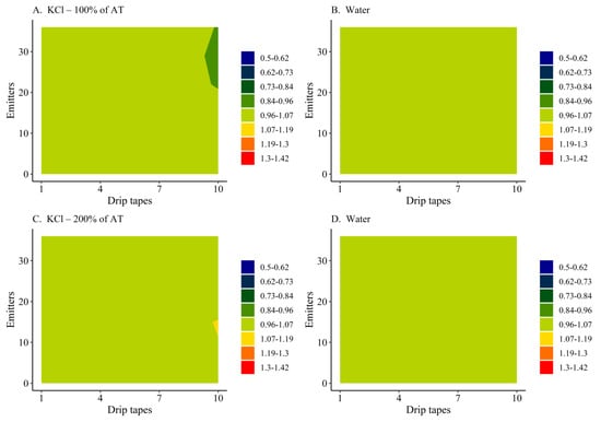 In general, the flushing times promoted satisfactory spatial distribution uniformity of KCl fertilizer and water, according to the contour plot (Figure 6). The spatial distribution of KCl showed a relatively small area with deficit at the end of the 10th lateral line for the 100% AT flushing time (Figure 6B) and an area with excess in the middle of the 10th lateral line for the 200% AT flushing time (Figure 6A). The spatial distribution of KCl with flushing time equivalent to 200% AT showed more similar homogeneity to the spatial distribution of water. The spatial distribution of irrigation water was quite homogeneous (Figure 6B,D).